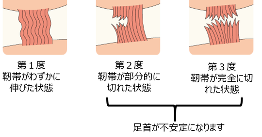III度: 靭帯の完全断裂。関節が著しく不安定になり、手術が必要となる場合もある。