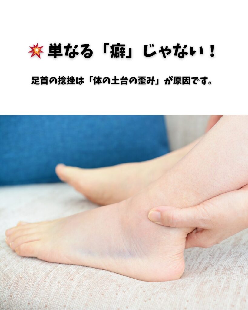 捻挫は「癖になる」と言われますが、それは、靭帯が伸びてグラグラになった状態を、適切な治療で根本的に治しきれていないからです。また、そもそも捻挫を繰り返してしまうのは、「体の土台である骨盤や股関節に歪みがあり、足首に過剰な負担がかかる着地フォームになっている」ことが原因です。