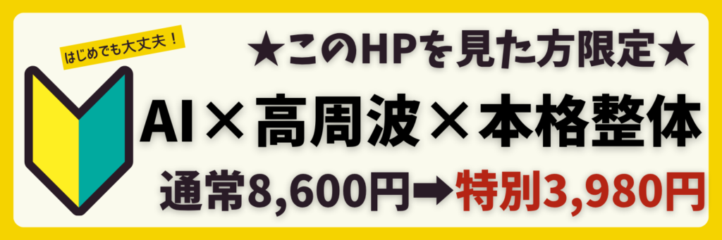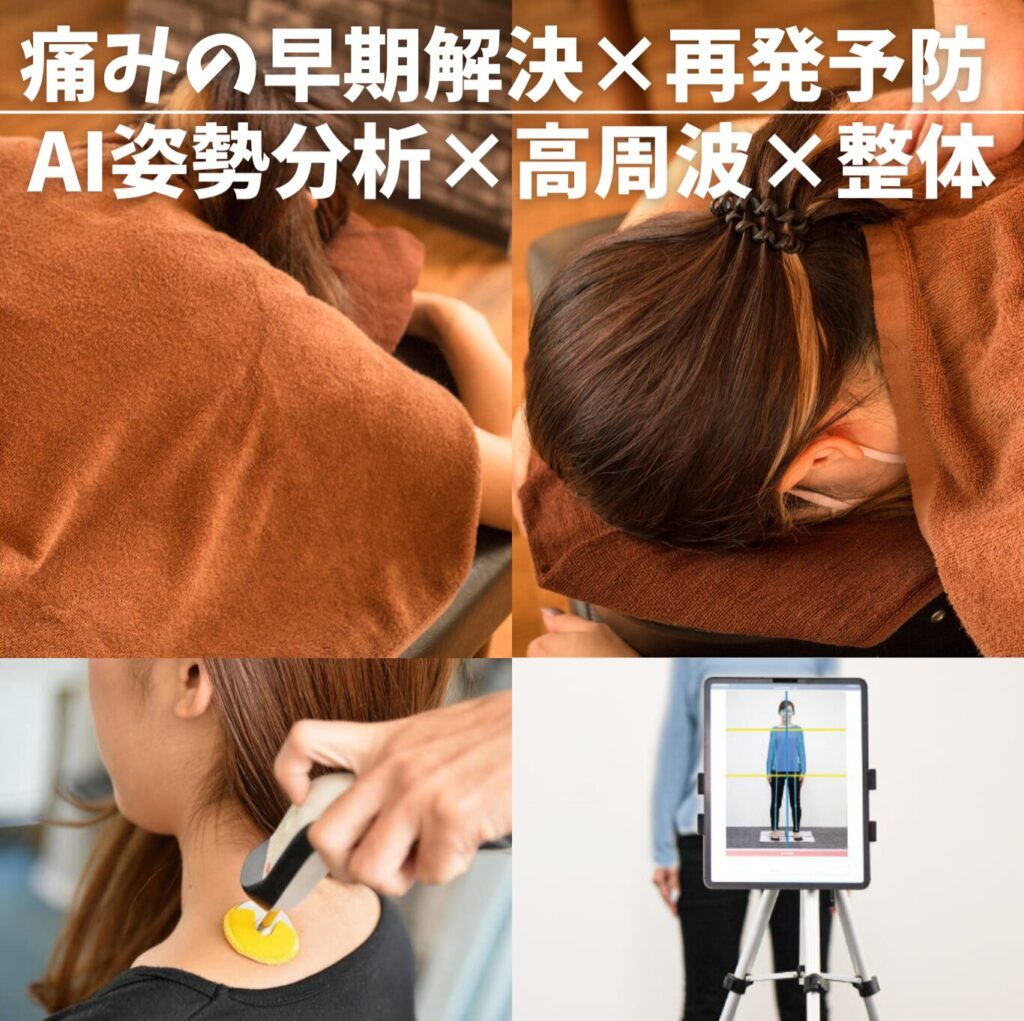 このような状態は、放っておくと悪化し、日常生活の質を大きく低下させてしまいます。そこで、初めてご来院の方限定で、痛みの早期解決に導き、姿勢と体の歪みを整える特別コースをご用意しました!このコースでは、しっかりしたカウンセリングとAI分析と高周波と本格整体で、あなたの体の歪みを「見える化」し、原因に根本からアプローチすることで、不調のない快適な体へと導きます。初回カウンセリングに備えて、体の不調の状態や困ってることなど事前にお知らせいただくと施術の参考になります。