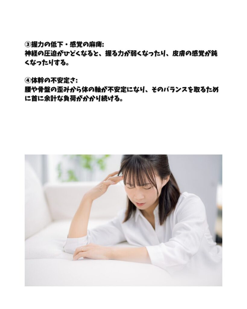 腰や骨盤の歪みから体の軸が不安定になり、そのバランスを取るために首に余計な負荷がかかり続ける。