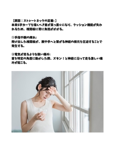 本来S字カーブを描くべき首が真っ直ぐになり、クッション機能が失われるため、椎間板に常に負担がかかる。