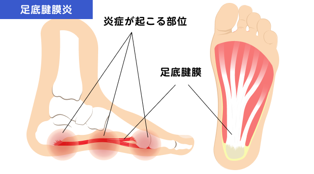 この筋膜に過度な負荷や牽引力(引っ張る力)が繰り返し加わることで、かかとの骨の付着部付近に微細な損傷と炎症が発生し、激しい痛みとなります。