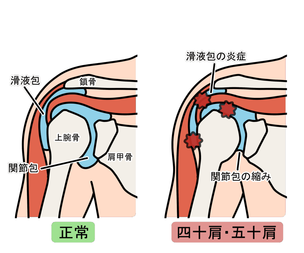 これは、肩関節を包んでいる「関節包(かんせつほう)」や「腱板(けんばん)」といった組織に炎症が起こり、痛みと可動域の制限を引き起こす疾患です。炎症により、関節包が硬く縮こまり(拘縮)、肩の動きをロックしてしまいます。