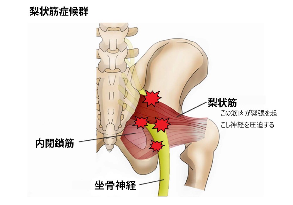 狭窄症やヘルニアがなく、お尻の筋肉(梨状筋)の緊張が坐骨神経を圧迫して坐骨神経痛を引き起こす場合もあります。