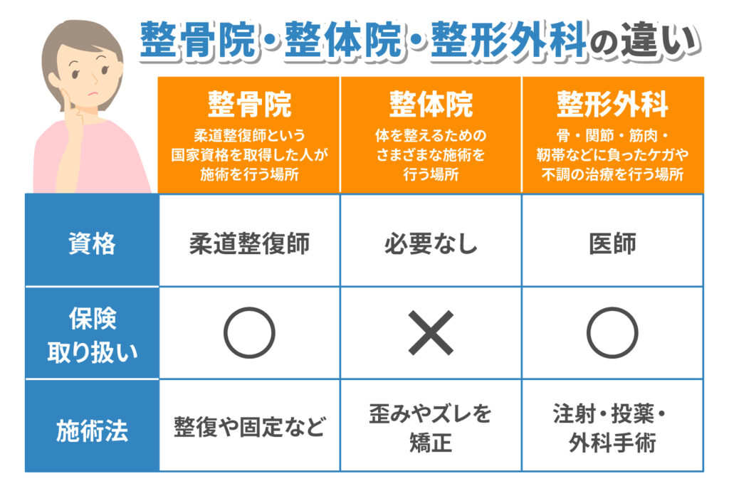 「整骨院(ほねつぎ)」と「整体院」は、どちらも体の不調を扱う施設ですが、法的な位置づけや施術内容に大きな違いがあります。