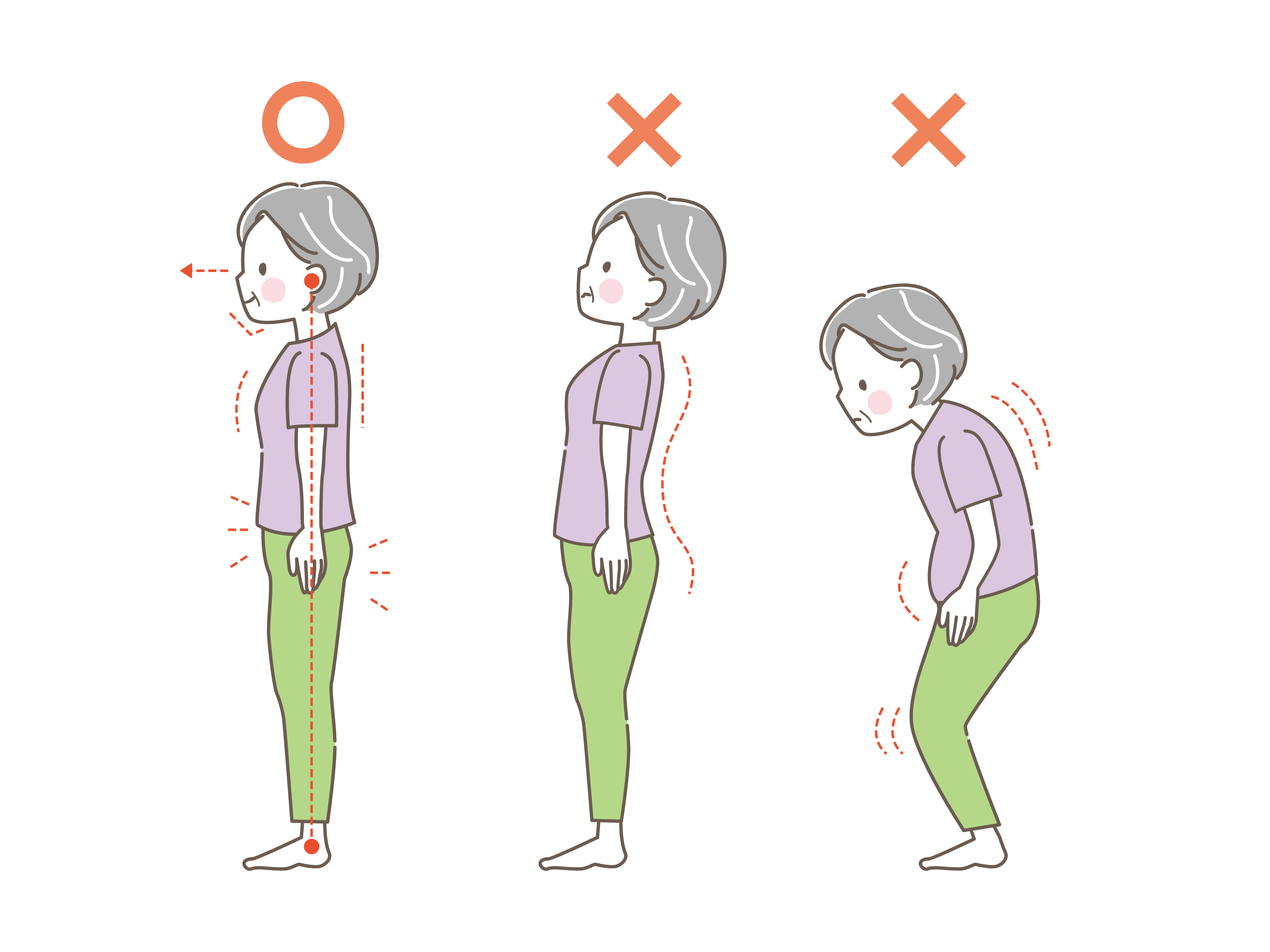 体幹が弱いと、重力に負けて姿勢が前かがみになり(猫背・前傾姿勢)ます。これは、見た目年齢を一気に老け込ませるだけでなく、バランス能力を低下させ、転倒リスクを高めます。特に高齢者にとって、転倒は寝たきりの大きな原因となります。