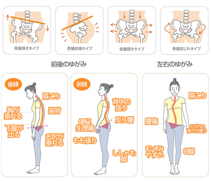 また、骨盤内の血管やリンパ管が圧迫されることで、血流が悪化し、代謝が落ちて太りやすくなり、むくみや冷え性も悪化します。
